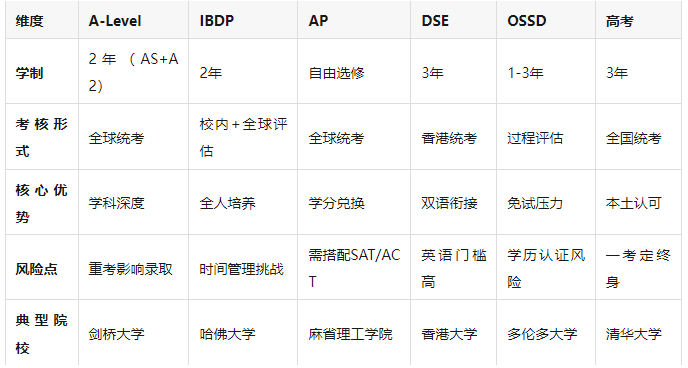 當“教育內卷”成為時代熱詞,越來越多的家庭開始將目光投向國際教育賽道。A-Level、IB、AP、OSSD、DSE五大國際課程與國內高考體系形成鮮明對比,它們或強調學科專精,或注重全面發展,或提供靈活路徑,共同構建起全球升學的“多軌并行”格局。本文以詳實數據與真實案例為基礎,深度解析五大課程的核心邏輯、適配人群與升學策略,并特別探討其自學可行性,為不同需求的學生與家庭提供理性選擇依據。